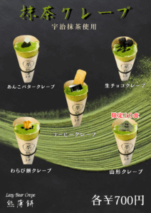 抹茶をベースにしたこだわりの抹茶クレープ5種類をご用意しました。